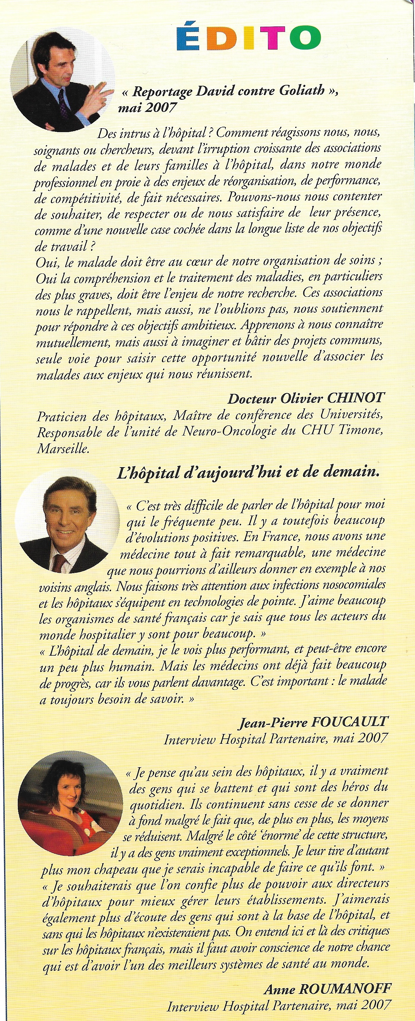 « Jean-Pierre FOUCAULT & Anne ROUMANOFF » ont été présents et très actifs. Tout au long des années qui ont suivi, ils ont permis, avec également la collaboration d’innombrables autres Artistes, de verser à la Recherche contre les tumeurs cérébrales, une somme avoisinant les 200.000 euros par l’intermédiaire de l’ ARTC SUD dont Dominique DAVID était la Présidente à l’Epoque, et du Professeur Olivier CHINOT.