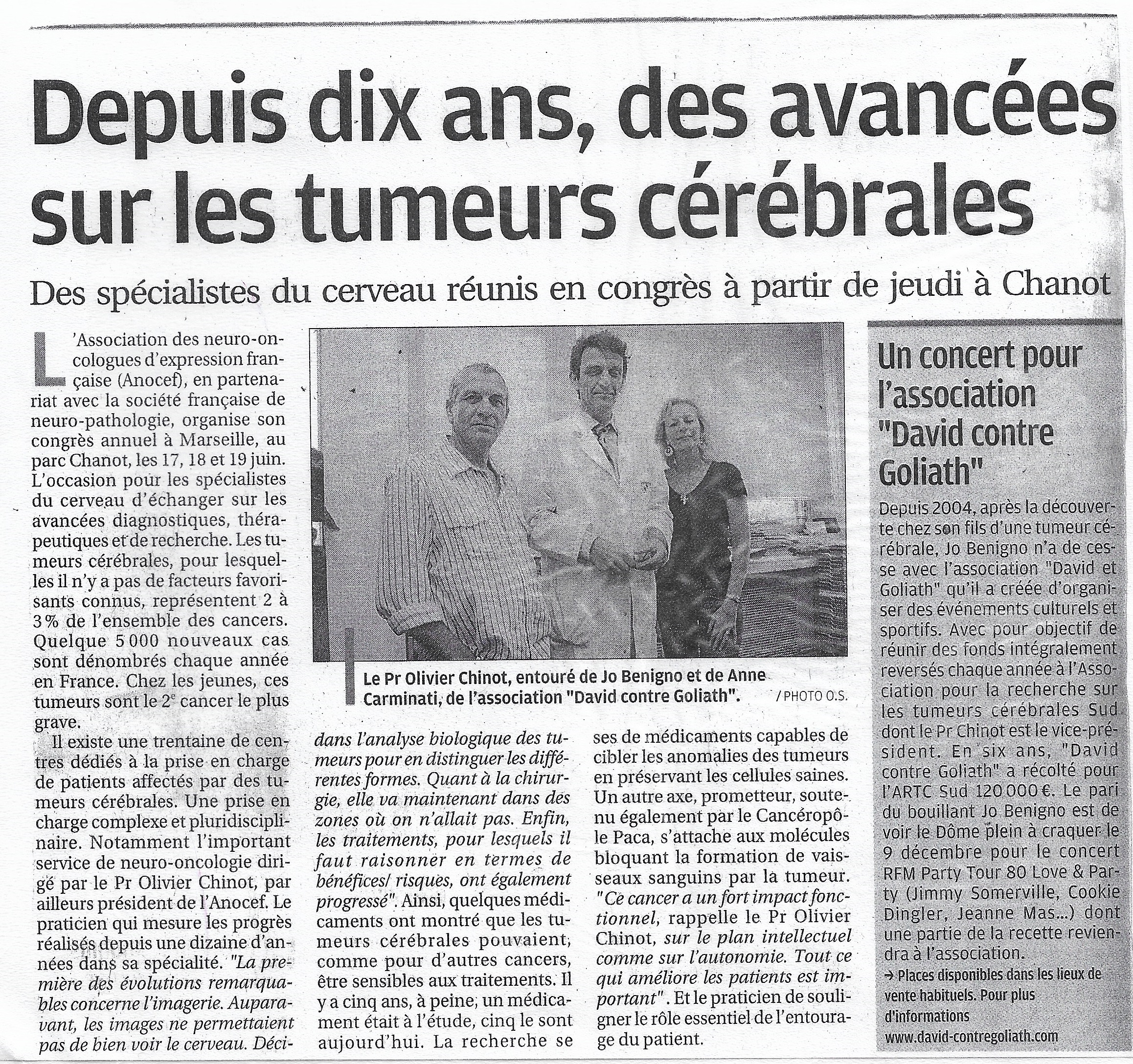 Le 26 Juillet le verdict tombe comme un couperet : il s’agit bien d’un cancer et les professeurs ne donnent à David que 6 moi de vie… S’en suivent des séances de Chimio et Radiothérapie, et c’est le Professeur Olivier CHINOT, neuro-oncologue à la TIMONE
